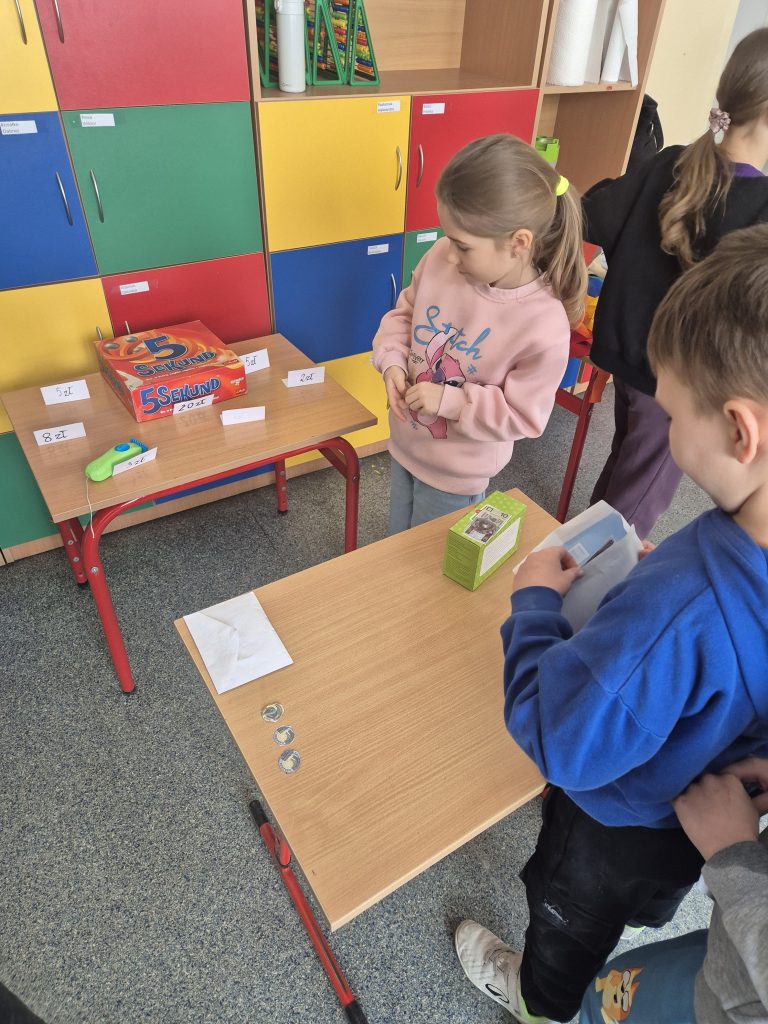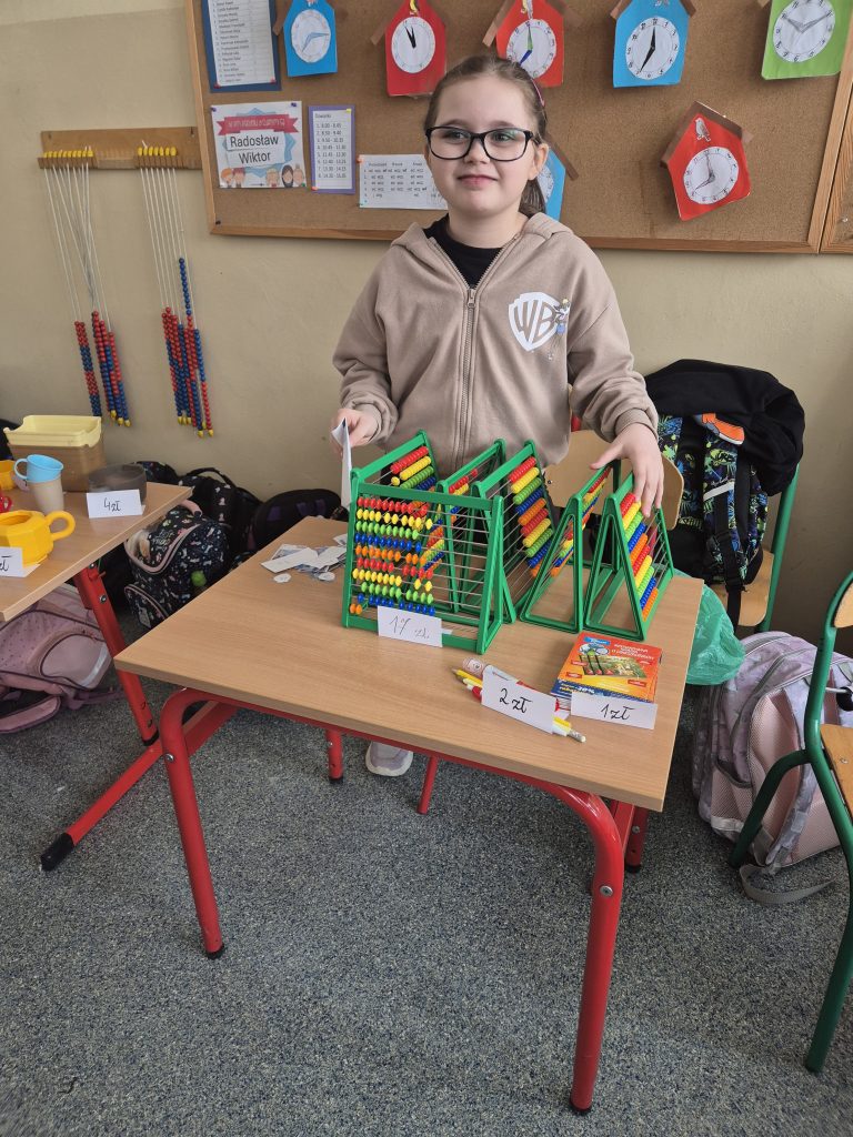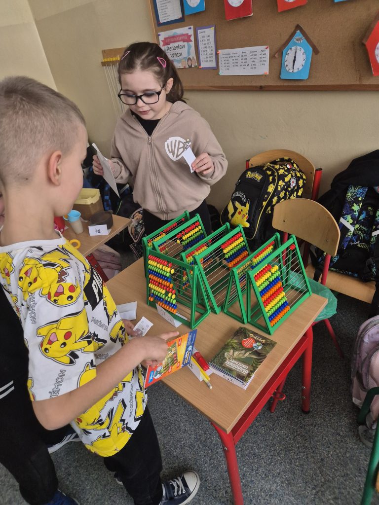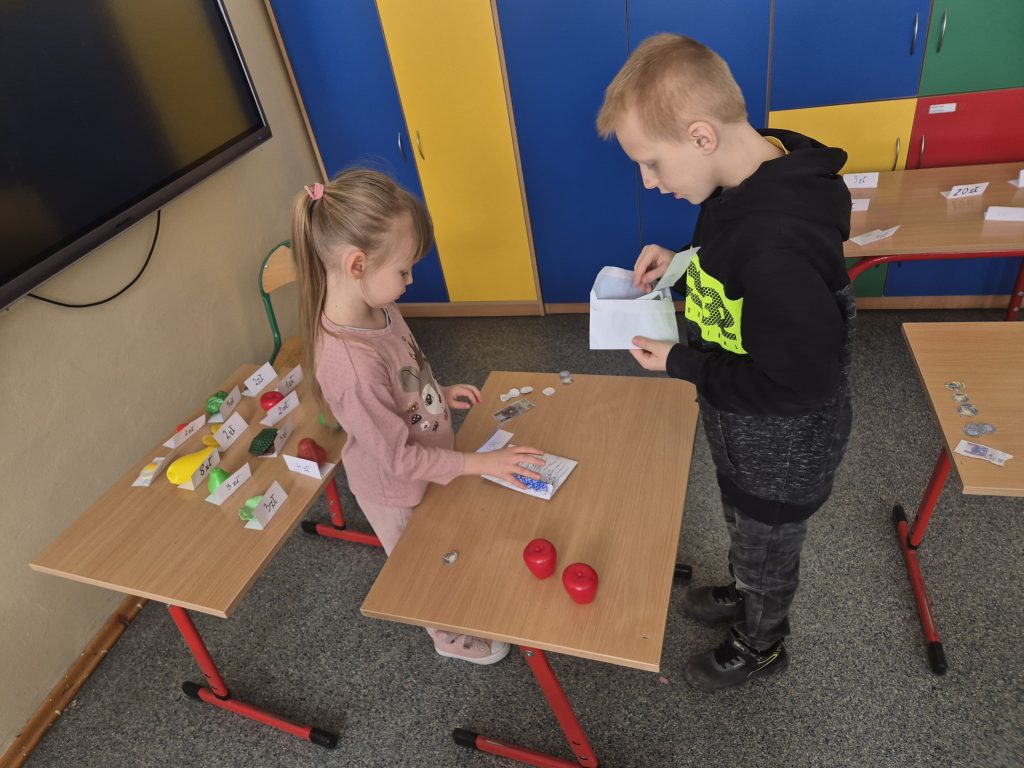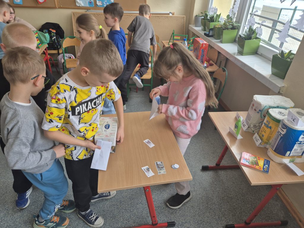 Podczas zajęć z zakresu edukacji matematycznej uczniowie klasy I uczestniczyli w zajęciach pt. „Zabawa w sklep”. Celem lekcji było utrwalenie umiejętności liczenia w zakresie poznanych liczb, doskonalenie dodawania i odejmowania w praktyce oraz kształtowanie właściwych zachowań podczas zakupów. Sala lekcyjna zamieniła się w stoiska sklepowe, a dzieci wcielały się w role sprzedawców i klientów. Uczniowie z dużym zaangażowaniem wykonywali zadania, współpracowali ze sobą i doskonalili umiejętności matematyczne poprzez zabawę.