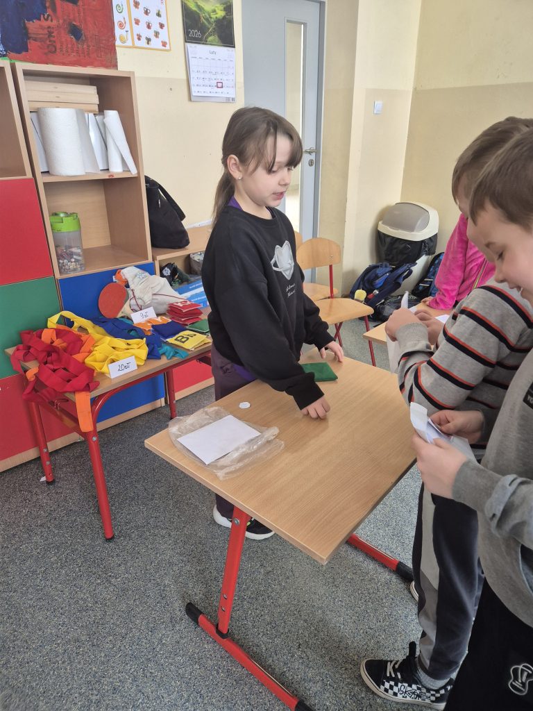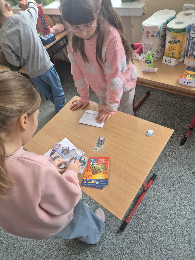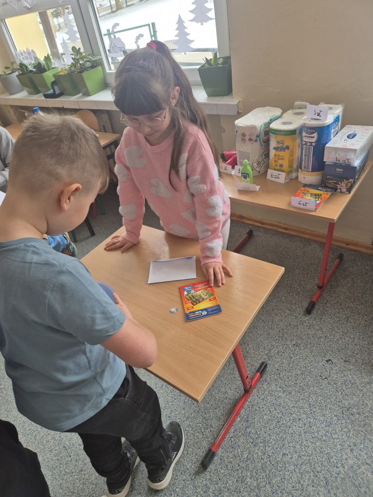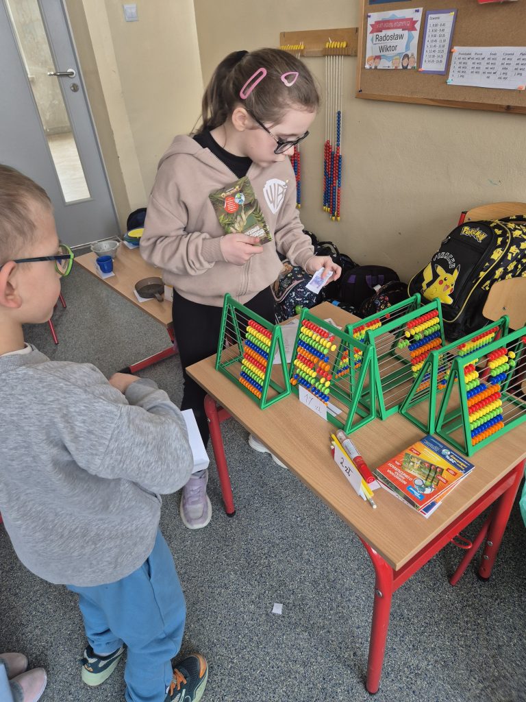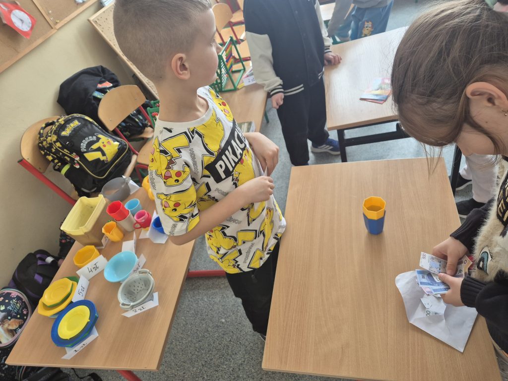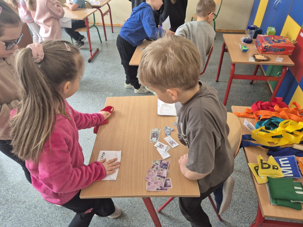 Podczas zajęć z zakresu edukacji matematycznej uczniowie klasy I uczestniczyli w zajęciach pt. „Zabawa w sklep”. Celem lekcji było utrwalenie umiejętności liczenia w zakresie poznanych liczb, doskonalenie dodawania i odejmowania w praktyce oraz kształtowanie właściwych zachowań podczas zakupów. Sala lekcyjna zamieniła się w stoiska sklepowe, a dzieci wcielały się w role sprzedawców i klientów. Uczniowie z dużym zaangażowaniem wykonywali zadania, współpracowali ze sobą i doskonalili umiejętności matematyczne poprzez zabawę.